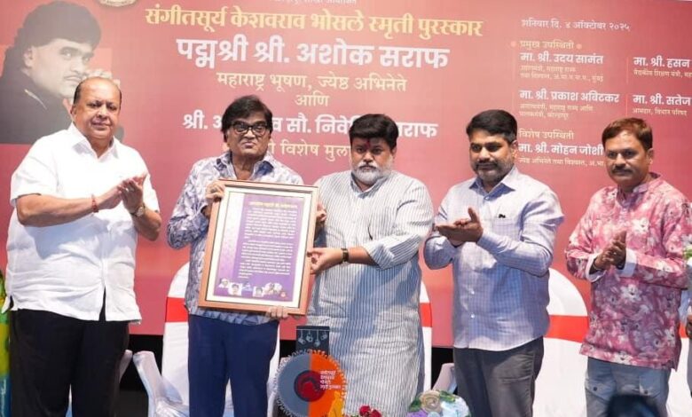 या सोहळ्यात ज्येष्ठ अभिनेते, पद्मश्री, महाराष्ट्र भूषण अशोक सराफ यांना त्यांच्या अतुलनीय अभिनय, विविधतेने समृद्ध कलाप्रवास आणि मराठी संस्कृतीस दिलेल्या मोलाच्या योगदानाबद्दल ना. उदय सामंत यांच्या हस्ते गौरविण्यात आले. या विशेष प्रसंगी ना. उदय सामंत यांनी त्यांचे मनःपूर्वक अभिनंदन करून शुभेच्छा दिल्या.