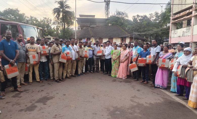 रत्नागिरी दि. २१ :- भारतीय जनता पार्टी महिला मोर्चा जिल्हाध्यक्षा सौ. वर्षा परशुराम ढेकणे आणि शहराध्यक्ष दादा ढेकणे यांच्या पुढाकाराने रत्नागिरी नगरपरिषदेच्या आरोग्य विभागातील सर्व कर्मचाऱ्यांचा सन्मान करण्यात आला. प्रधानमंत्री नरेंद्र मोदींनी सांगितल्याप्रमाणे “आत्मनिर्भर भारत” आणि “स्वदेशी वापरा” या संकल्पनेला प्रत्यक्ष स्वरूप देत या कर्मचाऱ्यांना स्वदेशी बनवलेल्या बॅगमध्ये दिवाळी फराळ व दिवाळी साहित्य देण्यात आले.