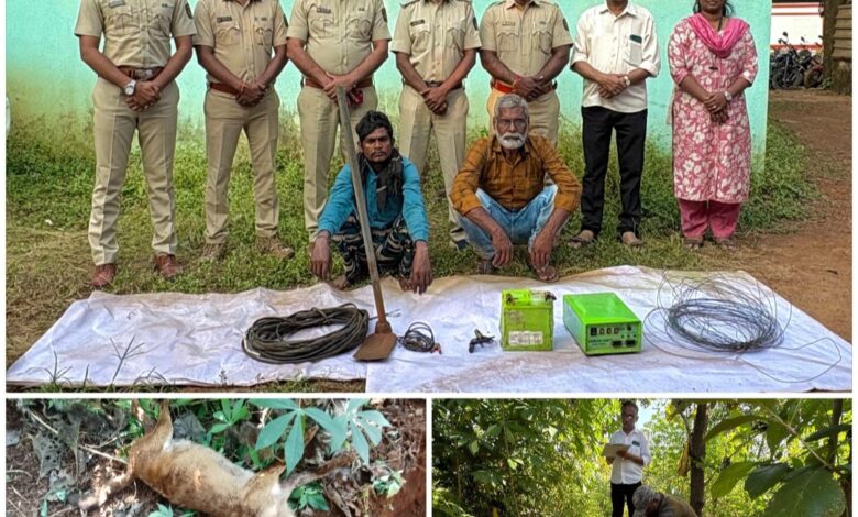 रत्नागिरी दि. २० :- संगमेश्वर तालुक्यातील मौजे- कोंडीवरे येथे दोन मृत रानकुत्र्यांना (कोळसुंदे) खड्डयात पुरल्या प्रकरणी दोन संशयितांना वनविभागाच्या अधिकाऱ्यांनी ताब्यात घेतले आहे. यामध्ये शेती संरक्षणासाठी वापरलेली तार, झटका मशीन, बॅटरी, वायर, चिमटा वायर, फावडा आदी साहित्य जप्त करण्यात आले आहे