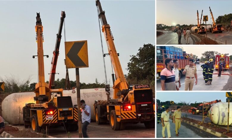 मुंबई गोवा महामार्गावरील चरवेली गावाजवळ अपघातामध्ये एलपीजी गॅस वाहतूक करणारा टँकर झाला पलटी